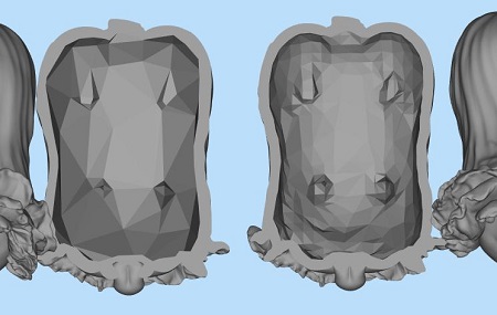 基本上所有光固化切片軟件都支持掏空功能,不過不同軟件掏空算法可能有區別,掏空的內部形狀不一樣。如圖,左側是赤兔軟件掏空的內部情況,而右側則是用magics來掏空的??梢詫Ρ劝l現,總體上掏空內容差不多,但magics掏空后內表面更加簡化光滑。更簡潔的內表面意味著三角面更少,切片過程更快,減少電腦運行壓力,這個對于大量中間模型切片時效用很大。同時也因為較少出現復雜內表面,減輕了內部清理的難度。