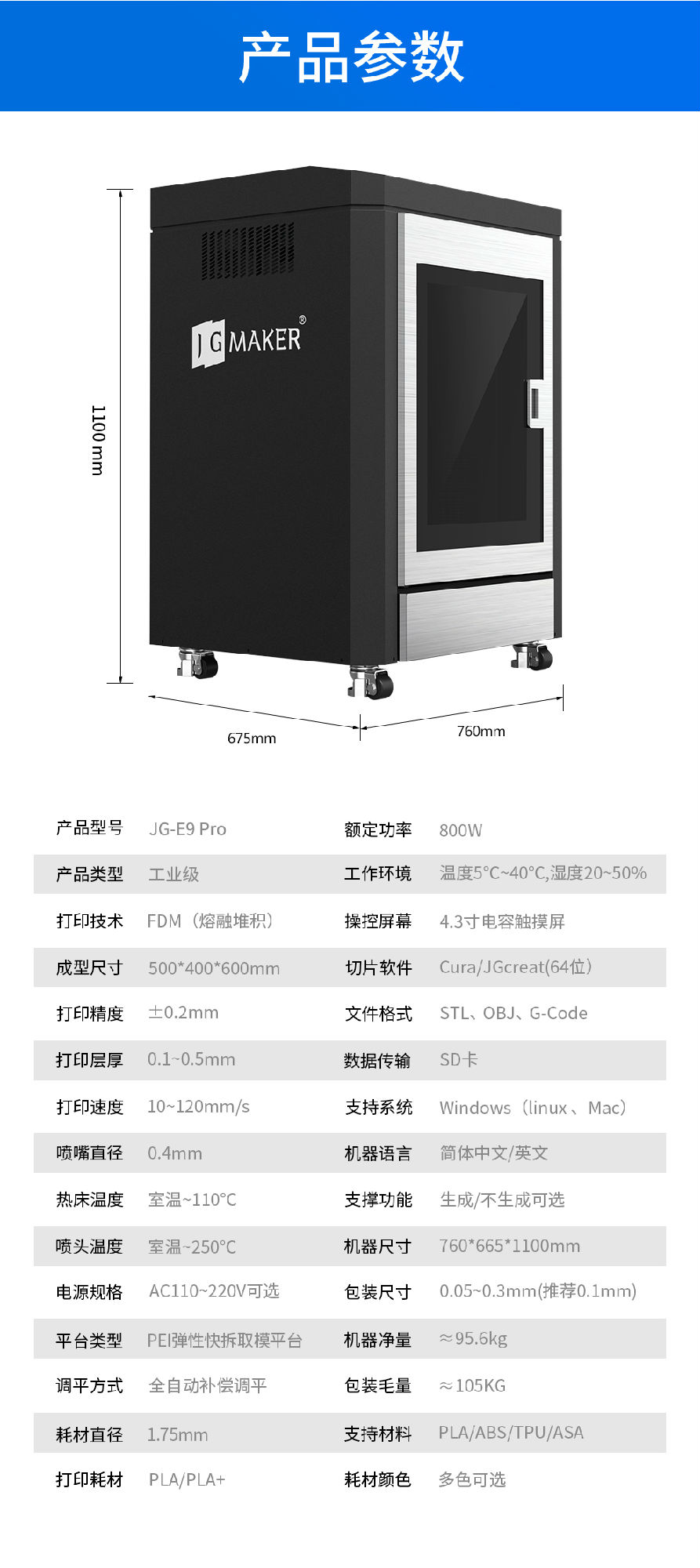 支持文件格式:STL, OBJ、 G-Code機器尺寸:760*665*1100mm